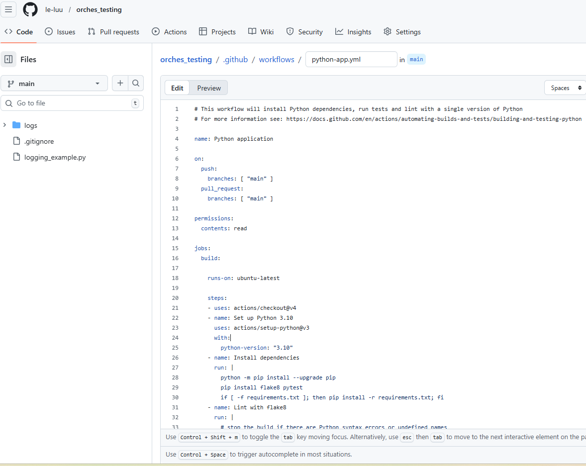 Then, you will see GitHub action creates a yaml files (.yml) for you called python-app.yml in .github/workflows/python-app.yml. We will use this YAML file to set up the trigger to run the Python script.