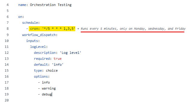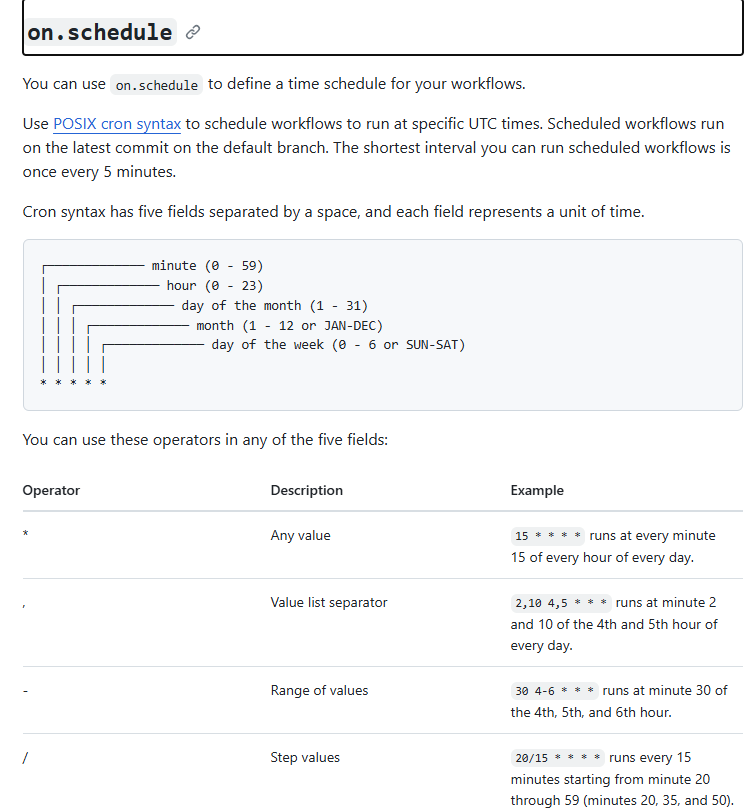 Inside the on, I will set the date and time in the week I want to run the Python script. So I use the schedule property, which you can check in the documentation page that I linked above. Note that the schedule follows the POSIX cron syntax (Fig. 22).