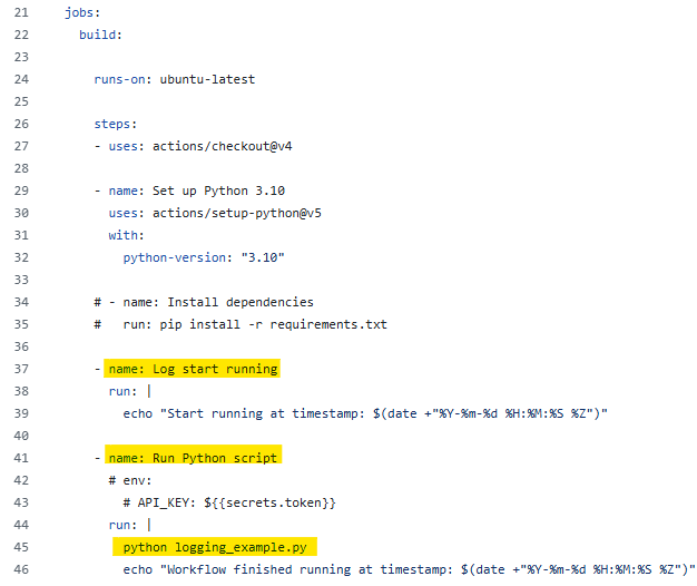 I created a new job for logging to start running and Run Python Script. I didn't install any Python packages to run the Python script, so I don't have the requirements.txt. You can also skip that. I also didn't use the environment to store the key value. In case you need to use it, just add the env with the key or token. On GitHub, go to Settings > Secrets and Variables > Actions. You can add the key/ variables there.