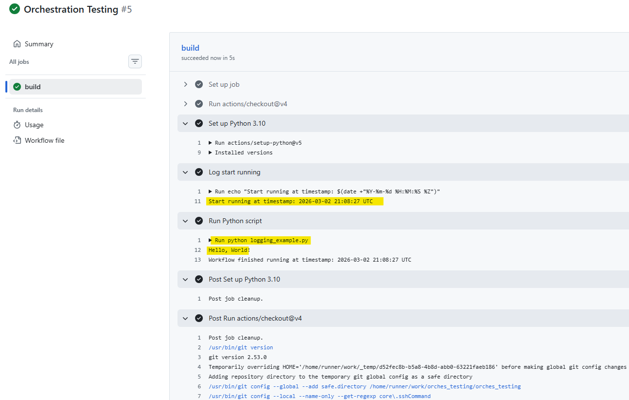 You can check the log after the workflow runs. From Fig. 26, you can see that the Python script was run. It prints "Hello, World!". You can also see that the log with a timestamp shows there.