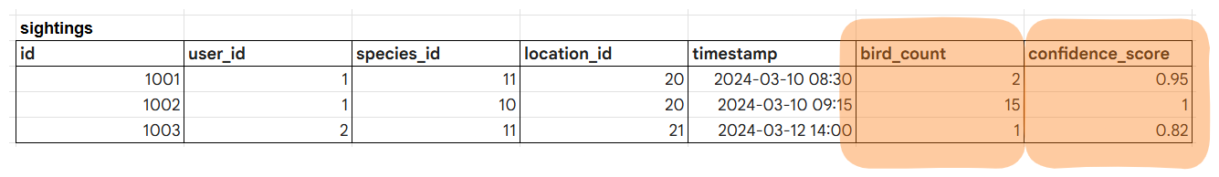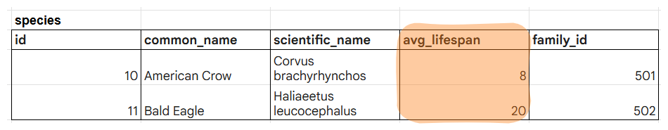 Both the sightings table and the species table contain a field that records some metric. For the sightings table, the metric recorded is bird_count and confidence_score. For the species table, the metric recorded is the avg_lifespan. In this case, the fact table would be 'sightings' and the dimension table would be 'species'. Even though lifespan is numerical data, in this scenario it would be used to categorize the records from the sightings table (find sightings of birds with an avg lifespan > 10 years). It would not be aggregated. Aggregation of numeric data should be done in the fact table, since we want to find out measurable information about the process of sightings.