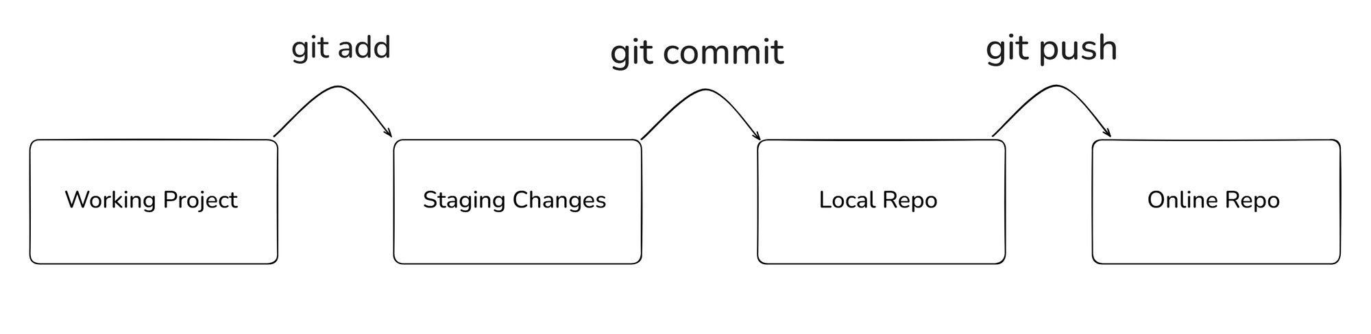 Once you've made some code and you want to start pushing it your online repo, it is simply a 3 step command process typed out in your terminal. First the git add simply stages the changes you've made and want to push. There are two ways of writing this:
