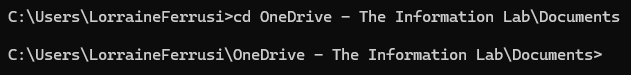To navigate between directories in the Command Prompt, you can use the cd (change directory) command. In the example below, I want to navigate to my documents directory, which is in my OneDrive folder.