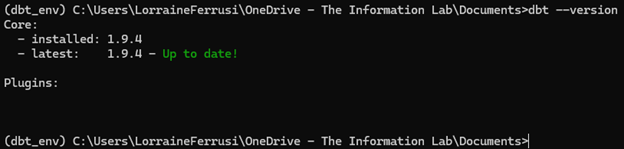This should display the version of dbt that has been installed, confirming that everything is set up correctly.