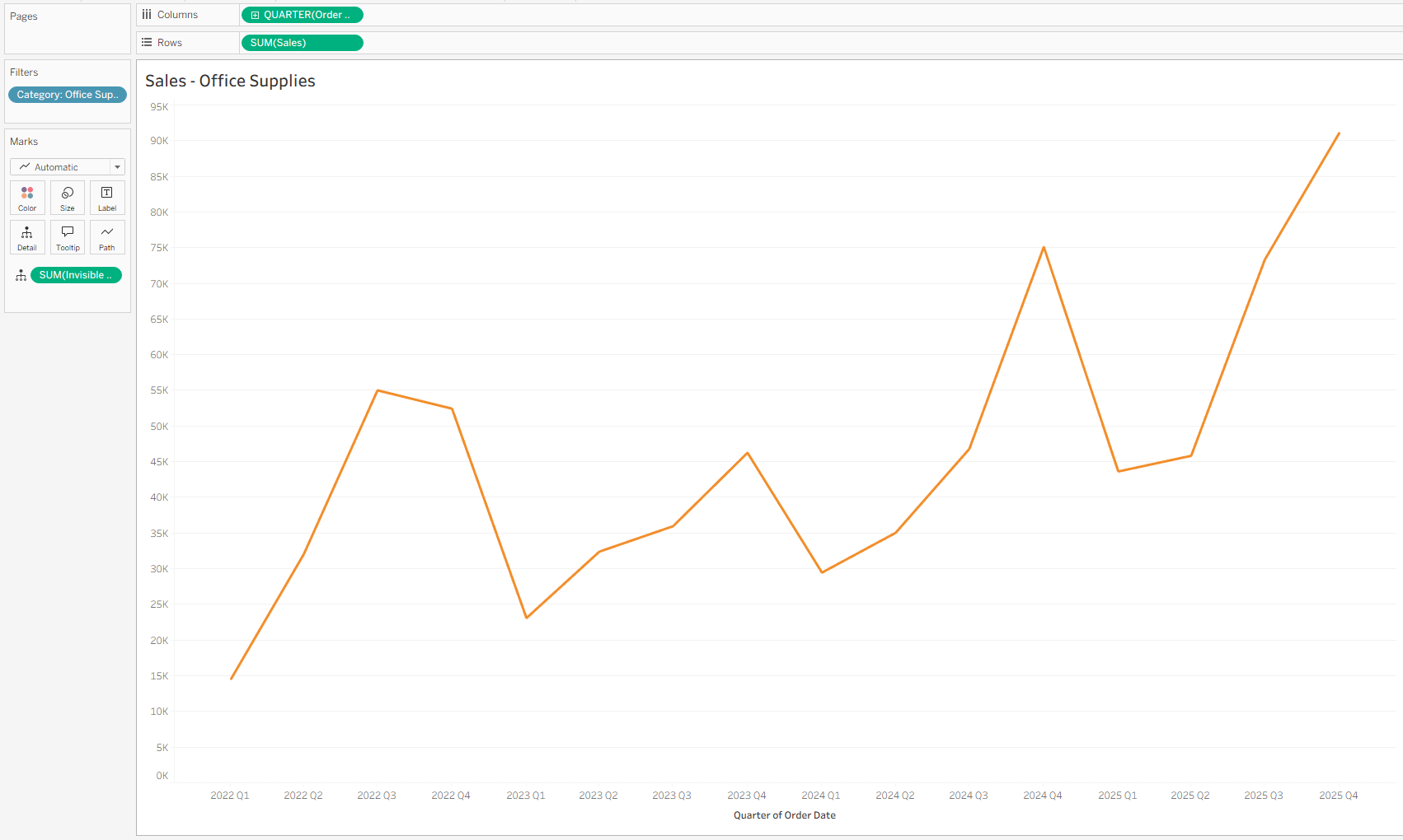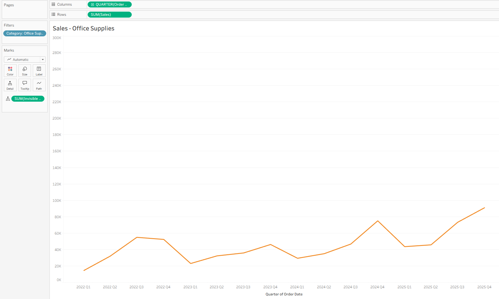 This returns SUM([Sales]) for each quarter based on Order Date. Because it is a FIXED LOD, it ignores Dimension filters according to Tableau’s order of operations (see Tableau documentation on order of operations).