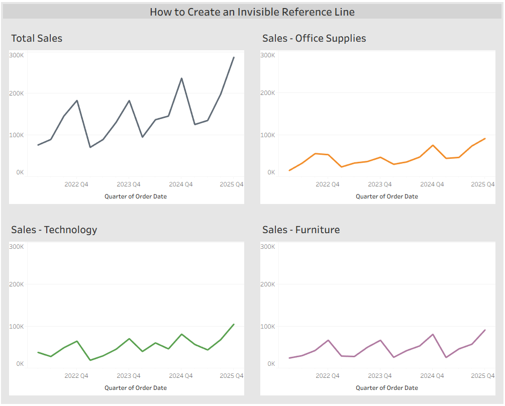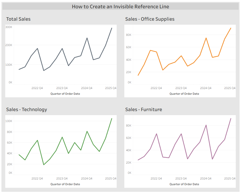 To achieve this, we can create invisible reference lines for the Office Supplies, Technology, and Furniture charts.