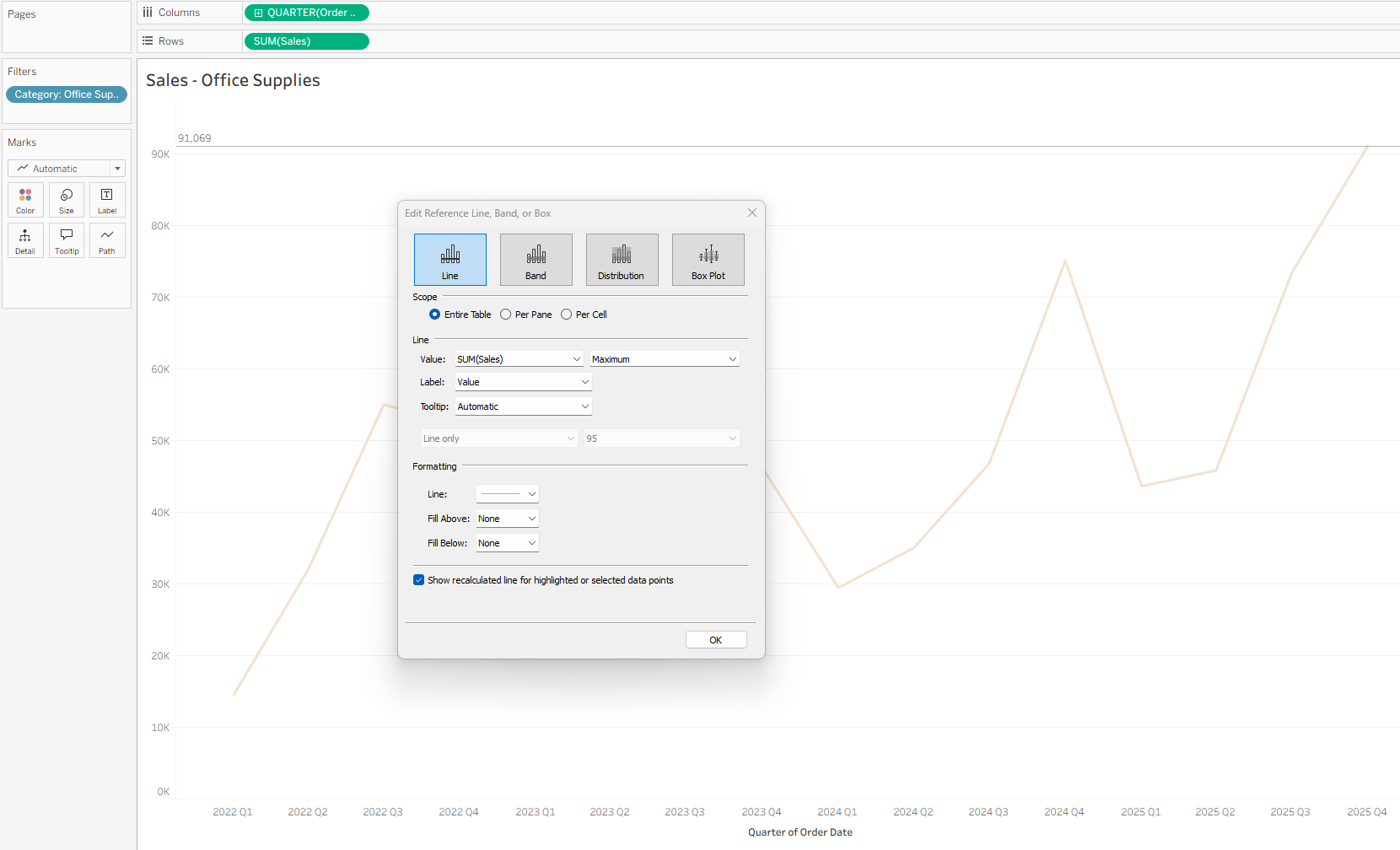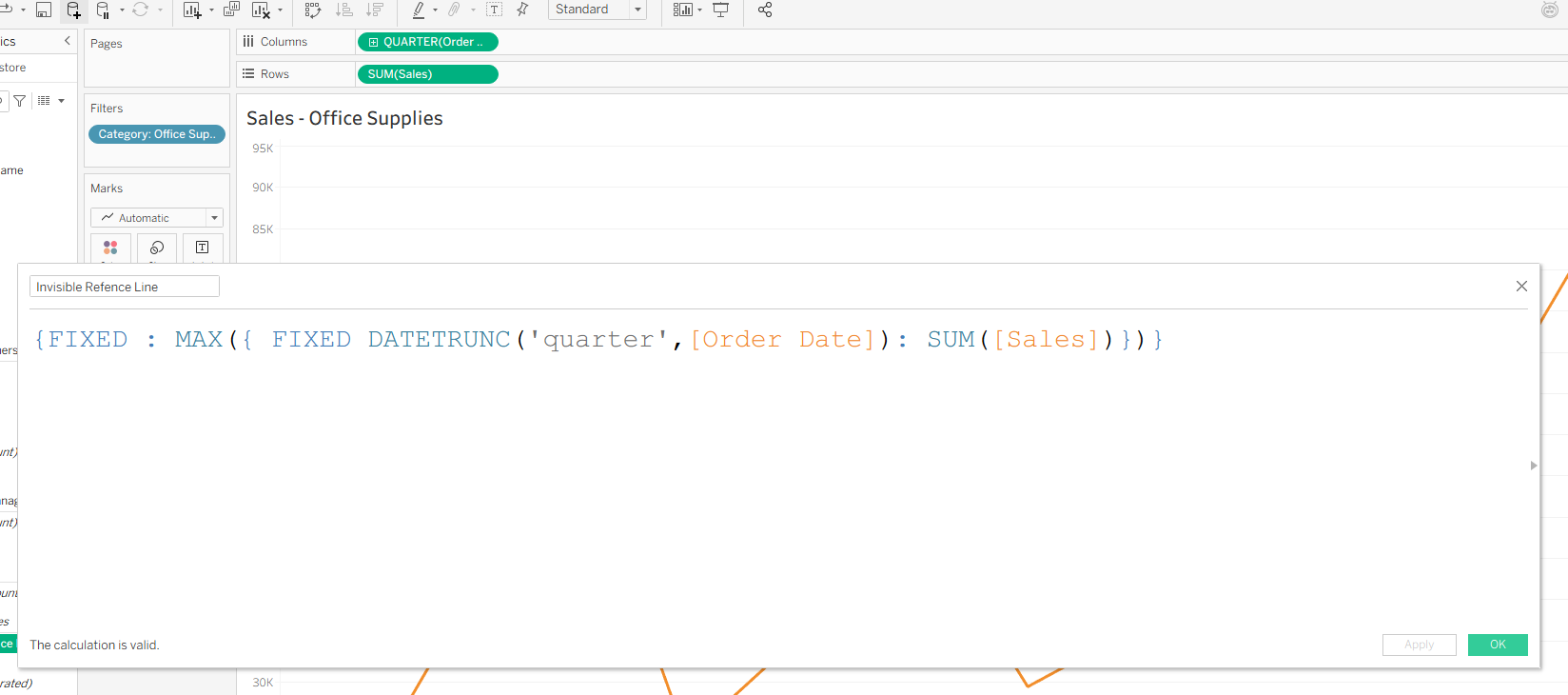 My initial thought was to create a reference line on the Sales – Office Supplies chart using the MAX(SUM([Sales])) value. However, this does not change the view; it only adds a reference line based on values currently in the worksheet. This happens because the MAX value is calculated after the Category: Office Supplies filter is applied.