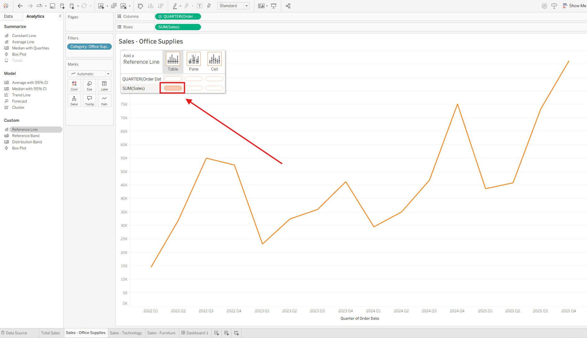 Drag Reference Line to Table on the SUM(Sales) axis.