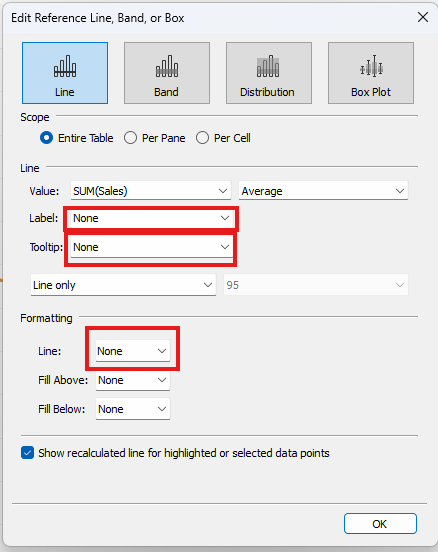 - Set Label, Tooltip, and the Line formatting option to None. This makes the reference line invisible. If you prefer to see the line while building the view, you can leave these options enabled and disable them later.