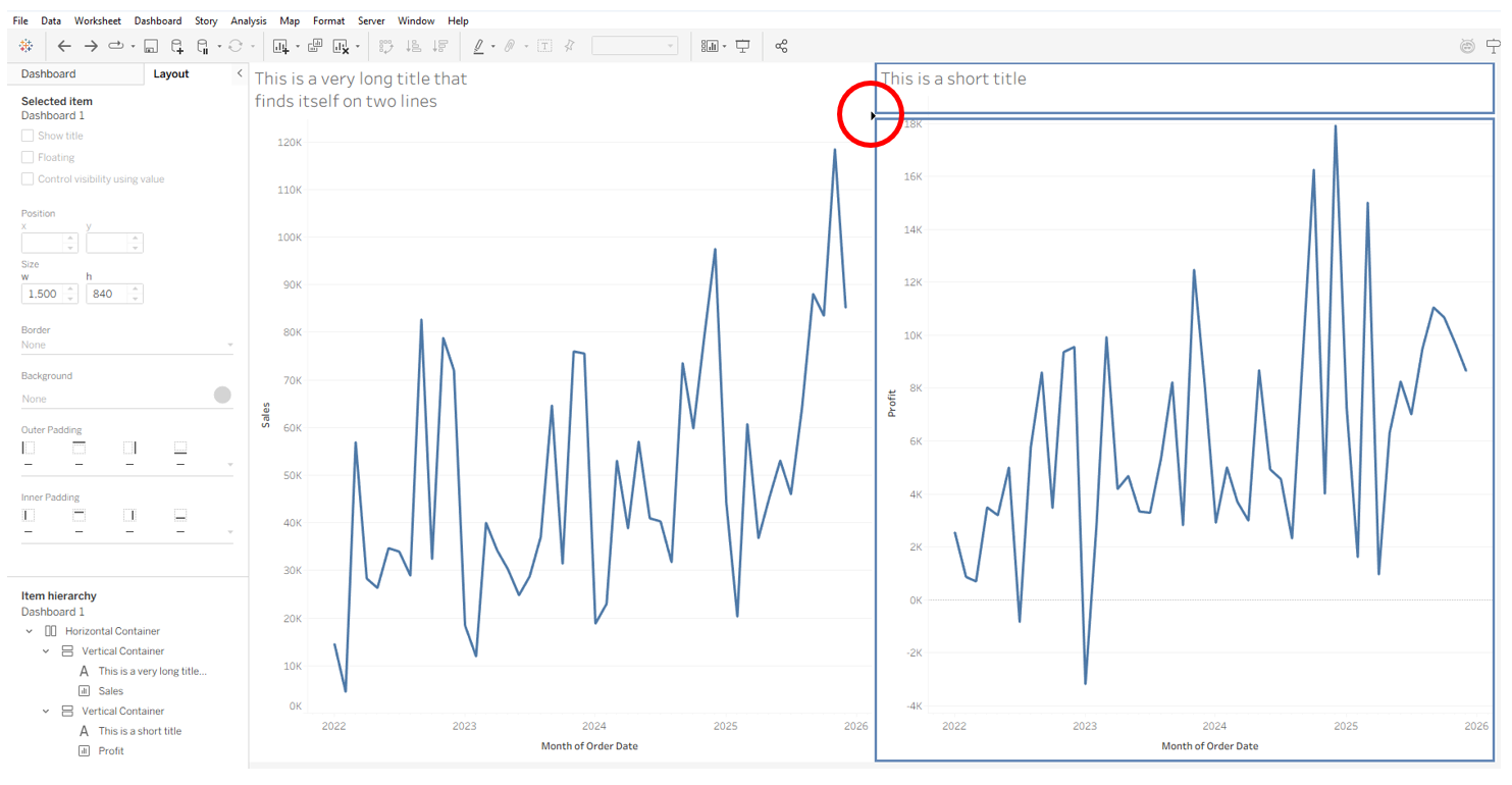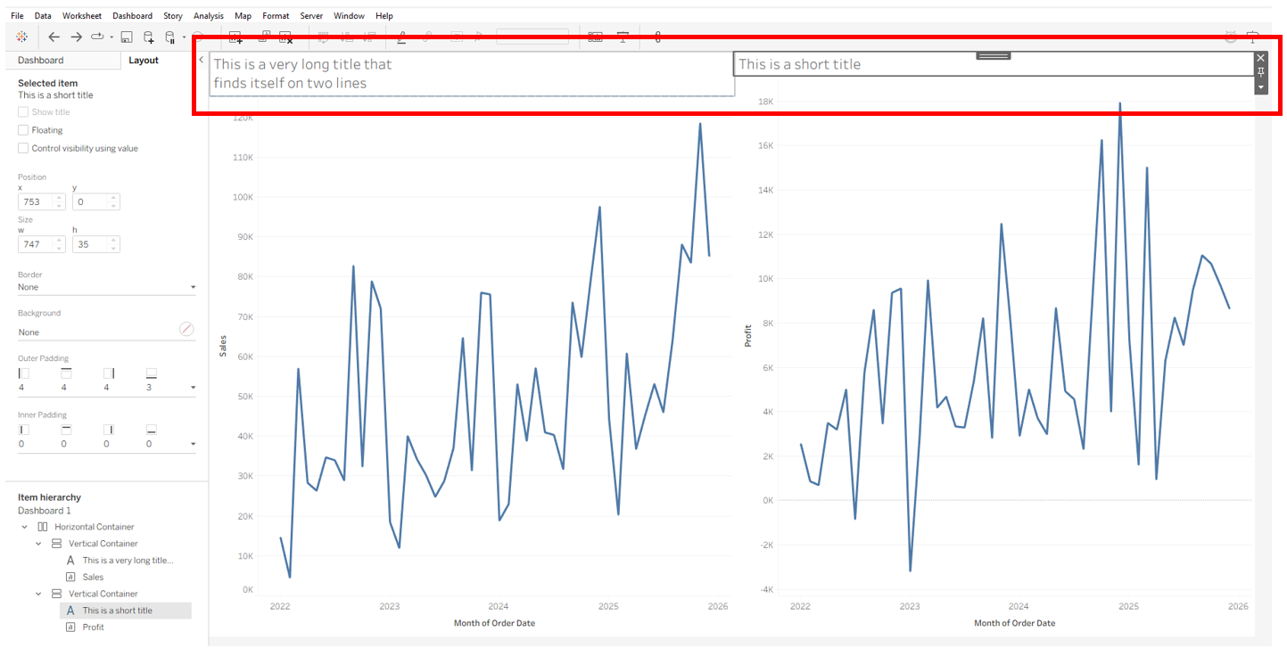 Fixing this initial issue doesn’t mean tiled containers are gone for good—they often reappear in other situations. One common case is when you’re working across containers and trying to line up two dashboard objects. For example, say you start with a horizontal container and place two vertical containers inside it. Then in each vertical container, you add one text block and one chart.