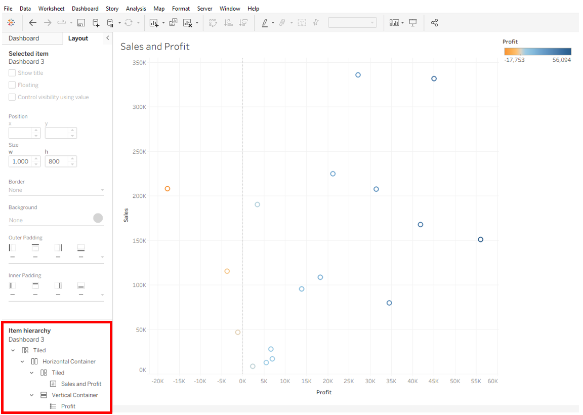 Tableau is built to create structured dashboards, so it tries to auto-populate your view with what it thinks will be most useful. The problem is, if you open a fresh dashboard and immediately drag a sheet onto the canvas, Tableau creates a tiled container by default. You can spot this by opening the Layout tab in the dashboard pane and checking the Item Hierarchy at the bottom. There, you’ll see multiple layers of containers: a top-level tiled container, a horizontal container inside it, another tiled container holding the chart, and a vertical container holding the legend. That’s far more containers than we actually need!