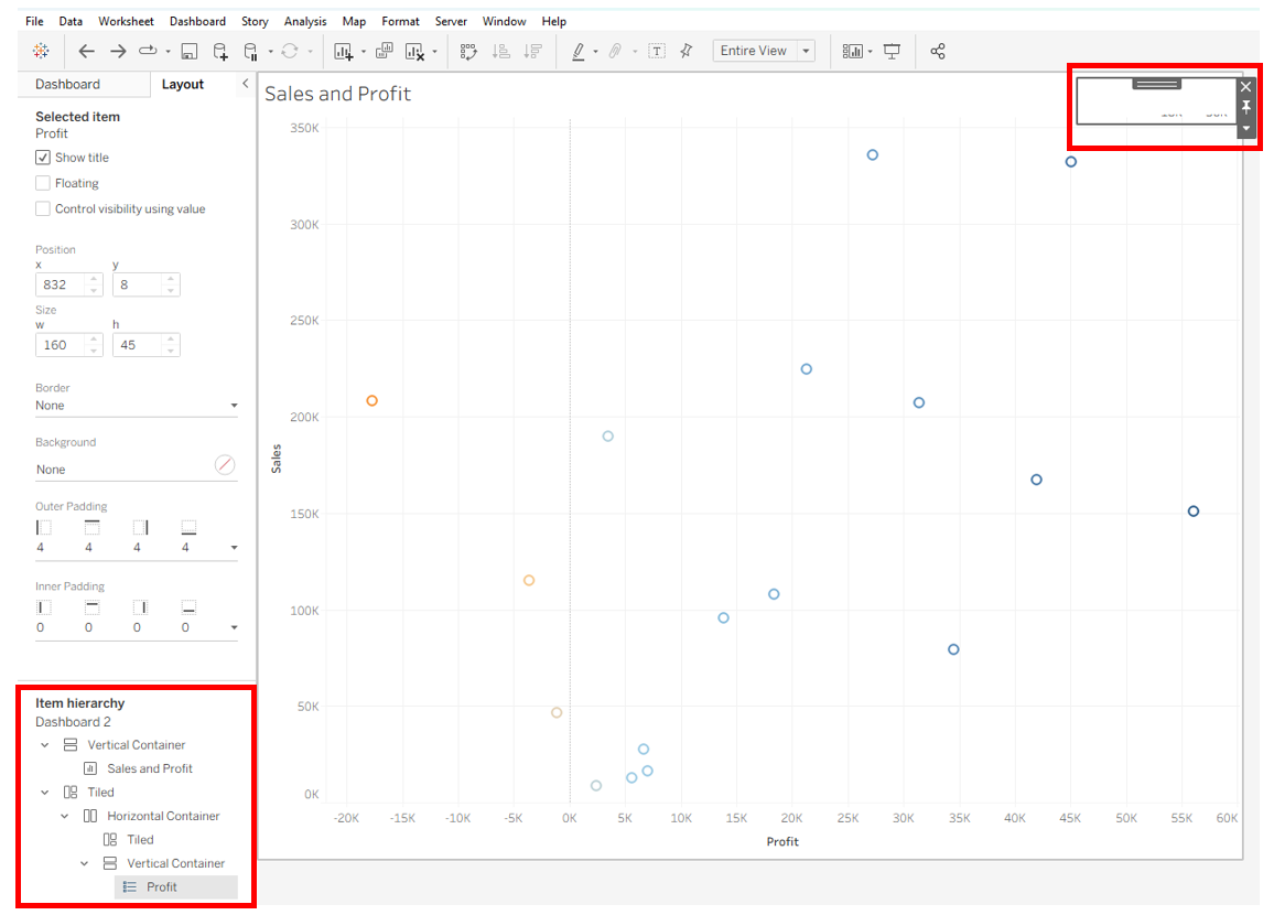 To fix this, open the Layout pane and drill down through the Item Hierarchy until you find the filter or legend you want. Click it in the hierarchy to highlight it on the dashboard, then drag it into the container where it belongs. After that, you can delete the extra tiled container blocks. Going forward, any new filters or parameters will usually appear in the same container as the one you just moved, and you can adjust their placement from there.