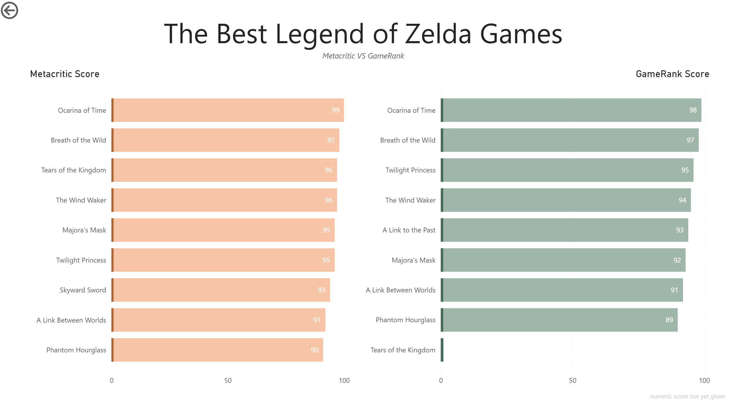 I started with a Makeover Monday I never posted: Top 100 games by Metacritic score. In Tableau, I filtered to Legend of Zelda games and made a fancy bar chart. It seemed like a really easy 'getting started' challenge.