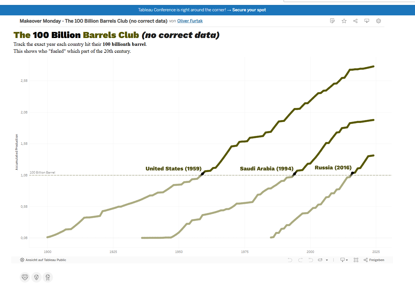 Here is the link to my visualization. https://public.tableau.com/views/MakeOverMonday_100BN_Barrel_Club/The100BillionBarrelsClub?:language=de-DE&:sid=&:redirect=auth&:display_count=n&:origin=viz_share_link
