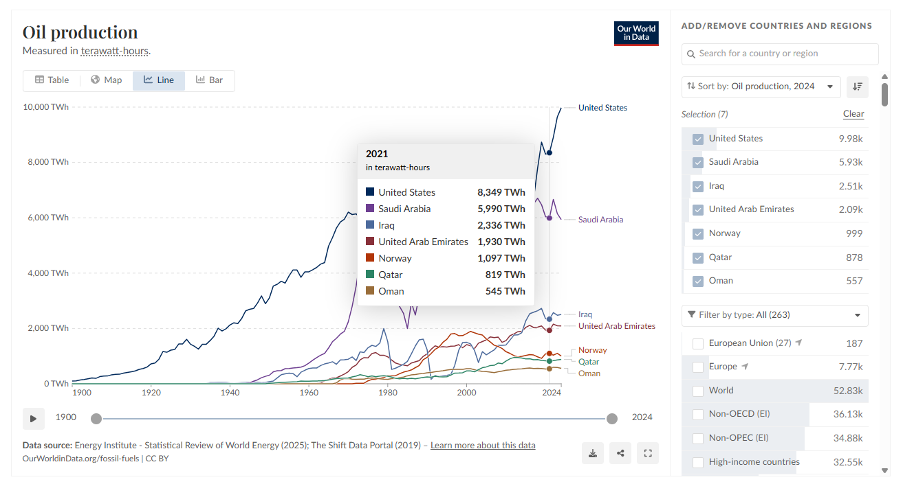 Here is the original dataset with visualization. https://ourworldindata.org/grapher/oil-production-by-country