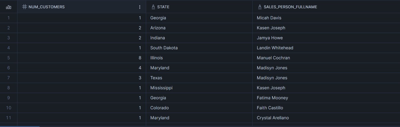 -- Distinct count of customers per state and sales person