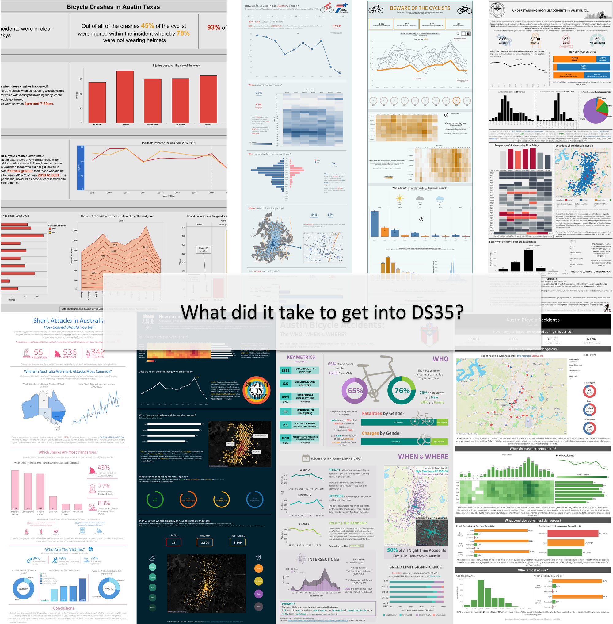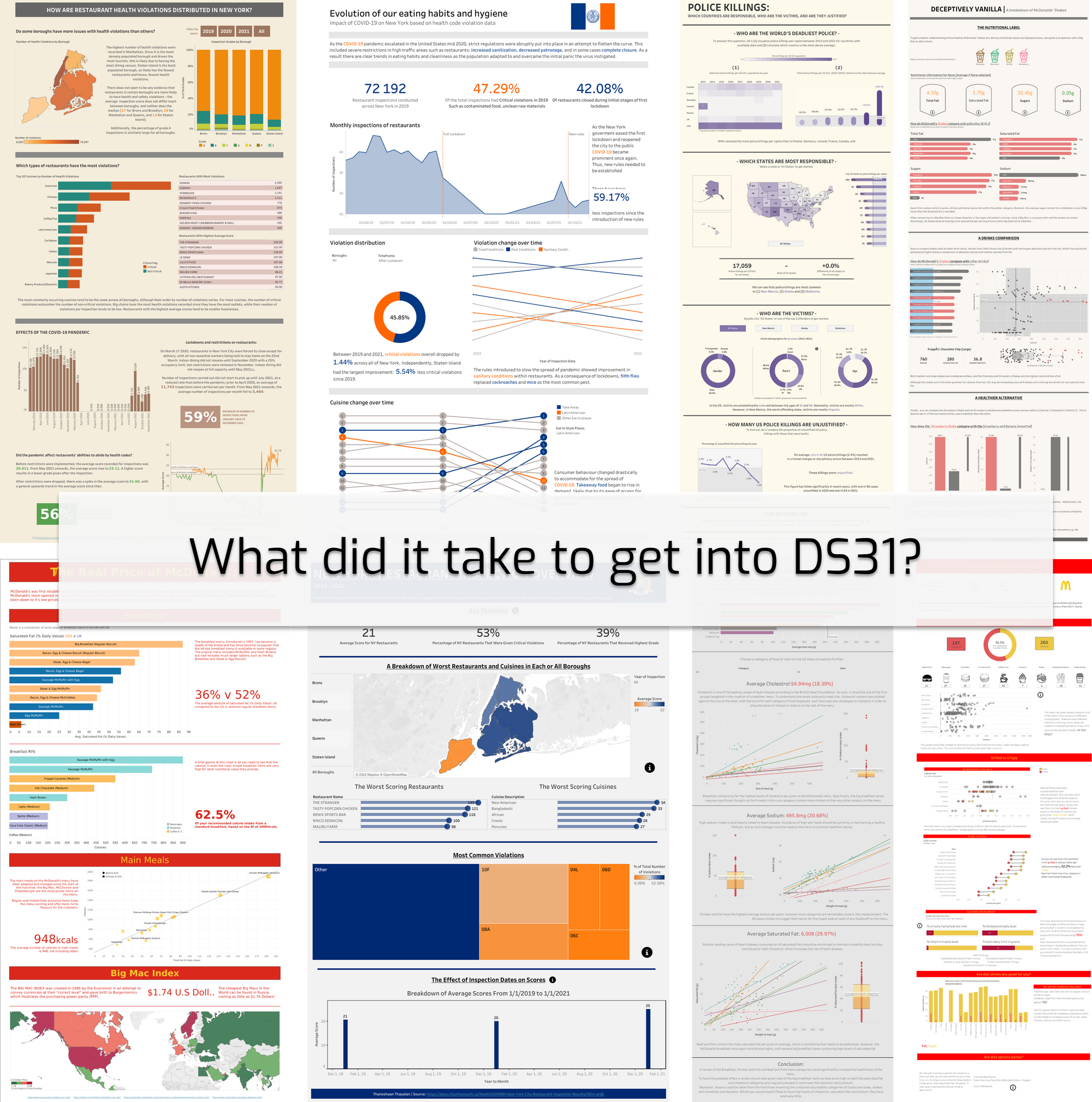 We had whopping 68 applications for DS15! They’re now a couple of months into their training, so it’s about time I show what they created to get into the DS. Let’s take a look at DS15’s applications. As you look at these, you might notice the data sets are different. Why? * Some of them applied early enough and showed enough promise that we brought them in for an early interview. * Some were finalists from previous cohorts, e.g., DS14, and were offered a spot in DS15. * Some were offe