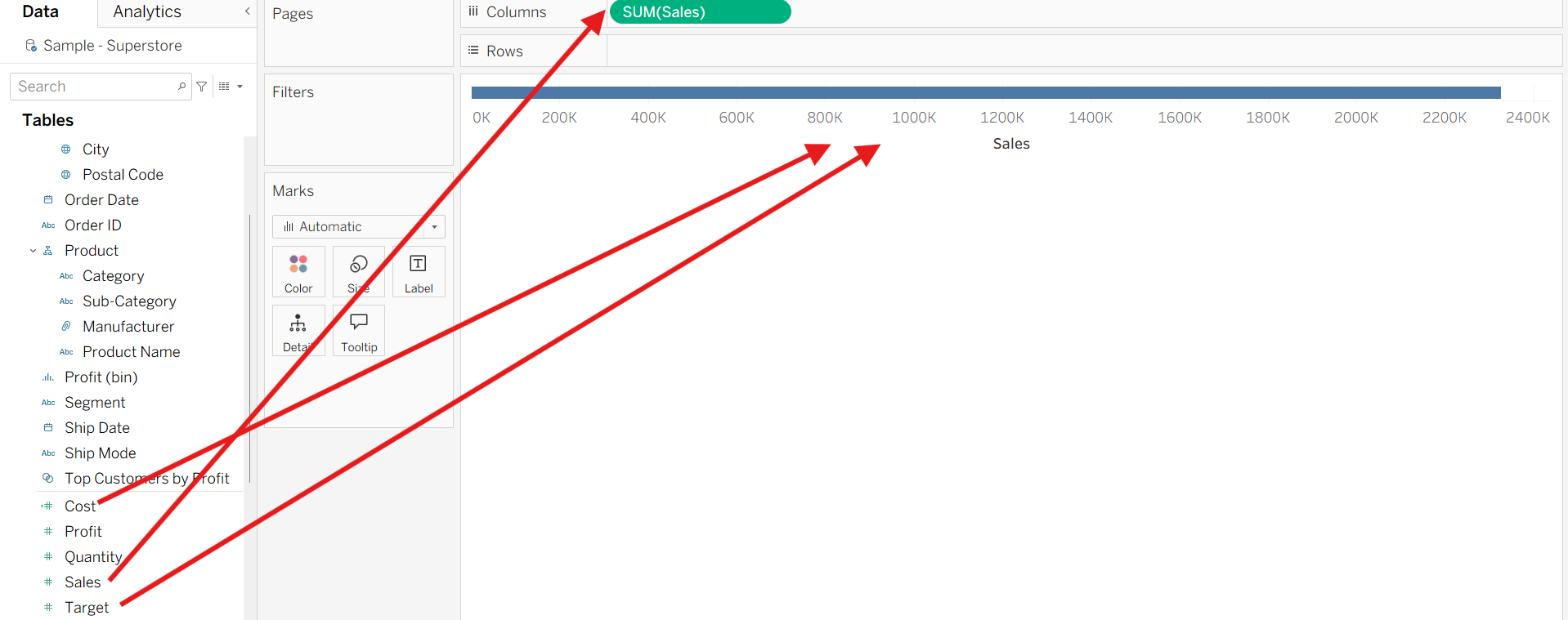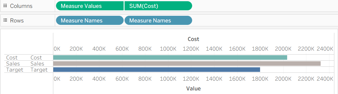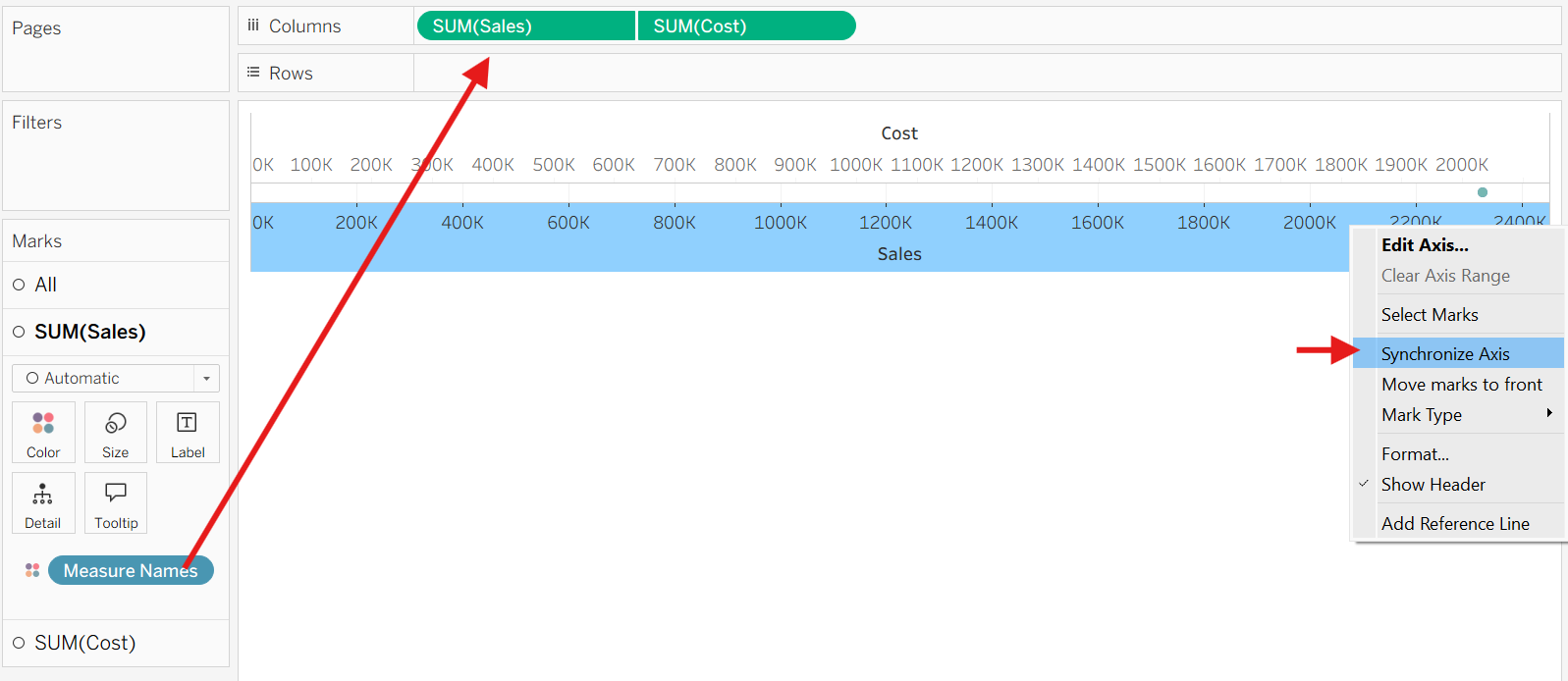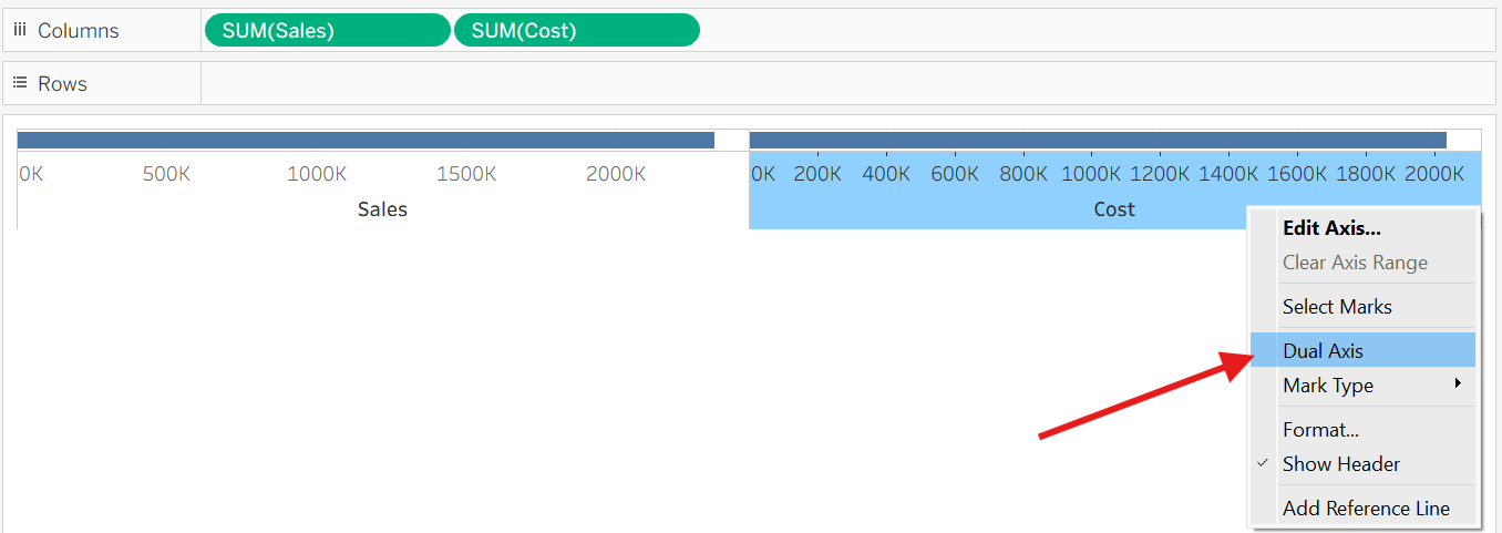 Say you want to compare two measures side to side: Sales vs Cost. You can do this by using dual axis.