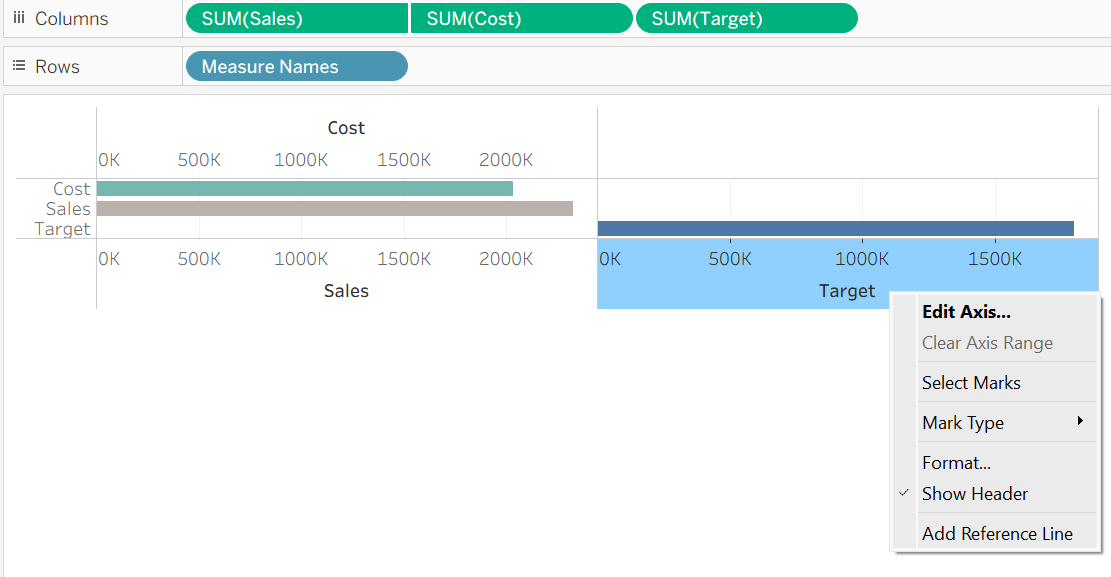 Now, try adding a third measure to compare - like Target - and you will see that there is no option to do dual axis anymore.