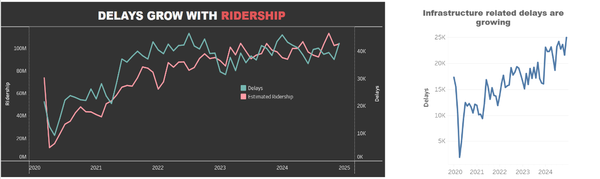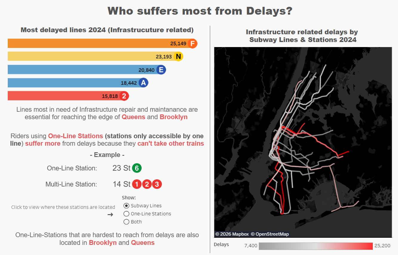 For my first dashboard, I used New York City’s subway data to create a visualization focused on subway delays. I had no prior experience with Tableau before starting, so this stage involved learning a lot about what Tableau can and cannot do.