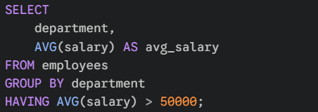 If you want to find departments with an average salary greater than 50,000, you cannot use WHERE, because the "average" hasn't been calculated yet when WHERE runs. You must use HAVING: