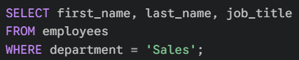 In plain English, this script tells the database: "Go to the employees table, find only the people who work in Sales, and show me their names and job titles."